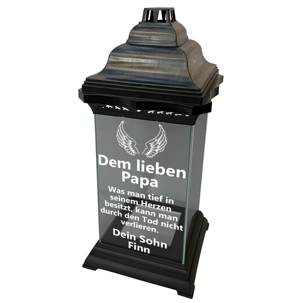 Ein stilvolles Grablicht, das Erinnerungen lebendig hält. Dieses personalisierte Grablicht bietet Ihnen die Möglichkeit, eine ganz individuelle Widmung, einen persönlichen Spruch sowie eine Unterschrift anbringen zu lassen – und damit ein einzigartiges Andenken an Ihre Liebsten zu schaffen.